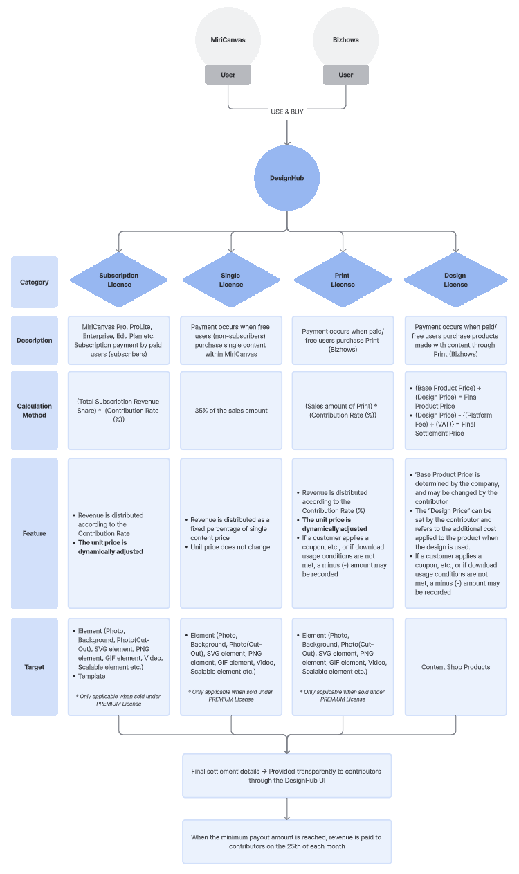 DesignHub generates revenue based on the license type whenever a MiriCanvas or Bizhows user purchases or downloads content.