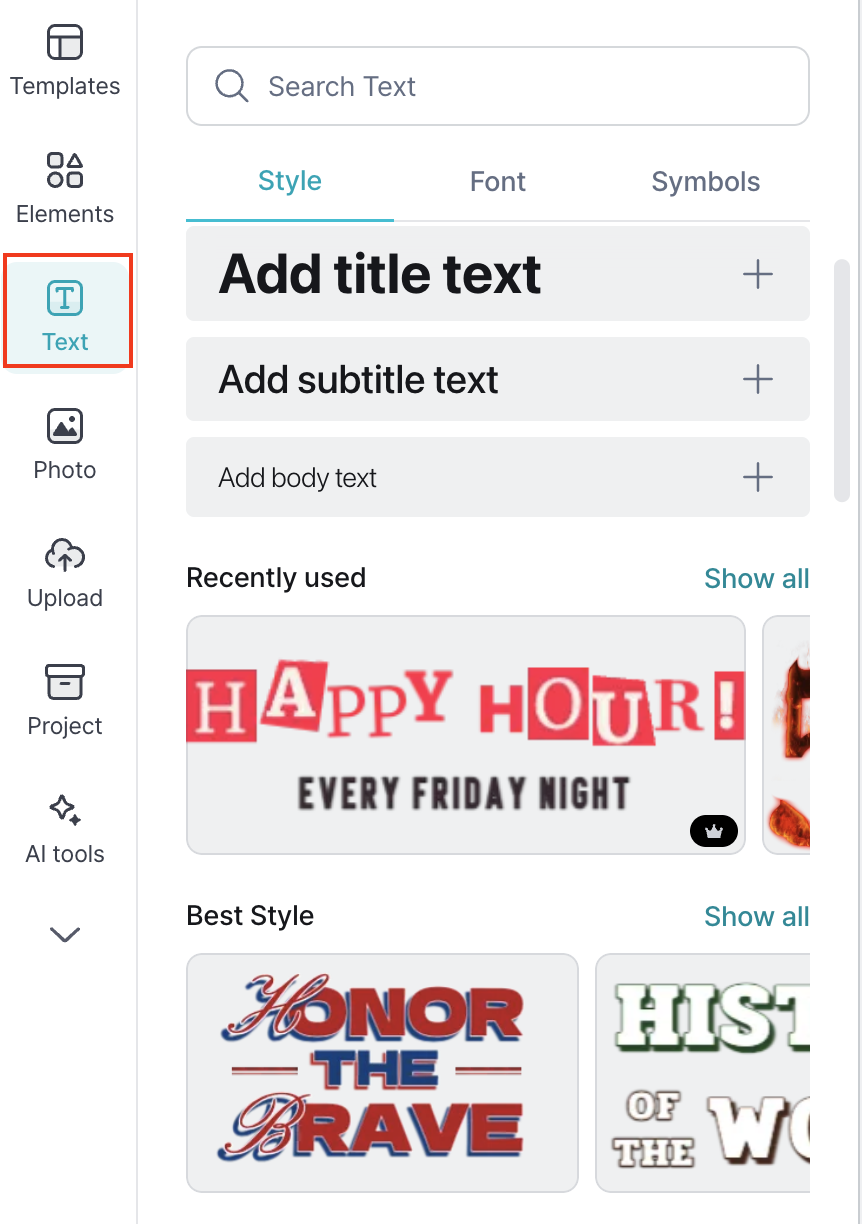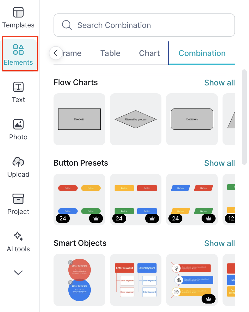 You can find the Combination Elements in [MiriCanvas > Elements > Combinations] and the Text Style in [MiriCanvas > Text].