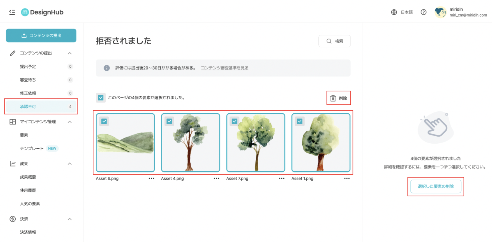 承認不可された素材は、直接削除することができます。 [コンテンツの提出] > [承認不可] ページで、削除したいコンテンツを選択して削除を行ってください。
