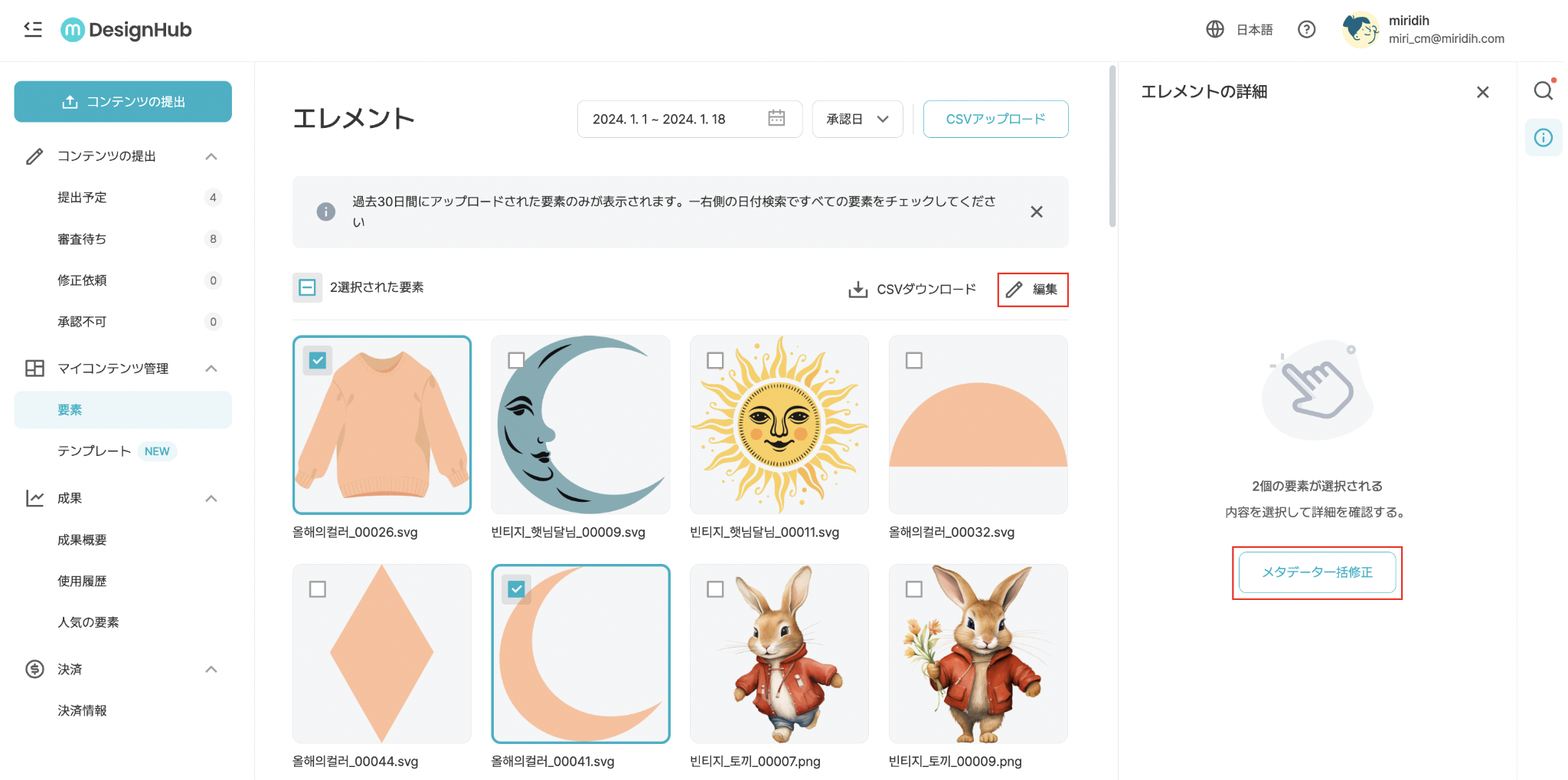 1)「素材」ページで非公開にしたいコンテンツを選択し、右上の「編集」ボタン、あるいは右側にあるタブの「メタデータ一括修正」ボタンをクリックしてください。