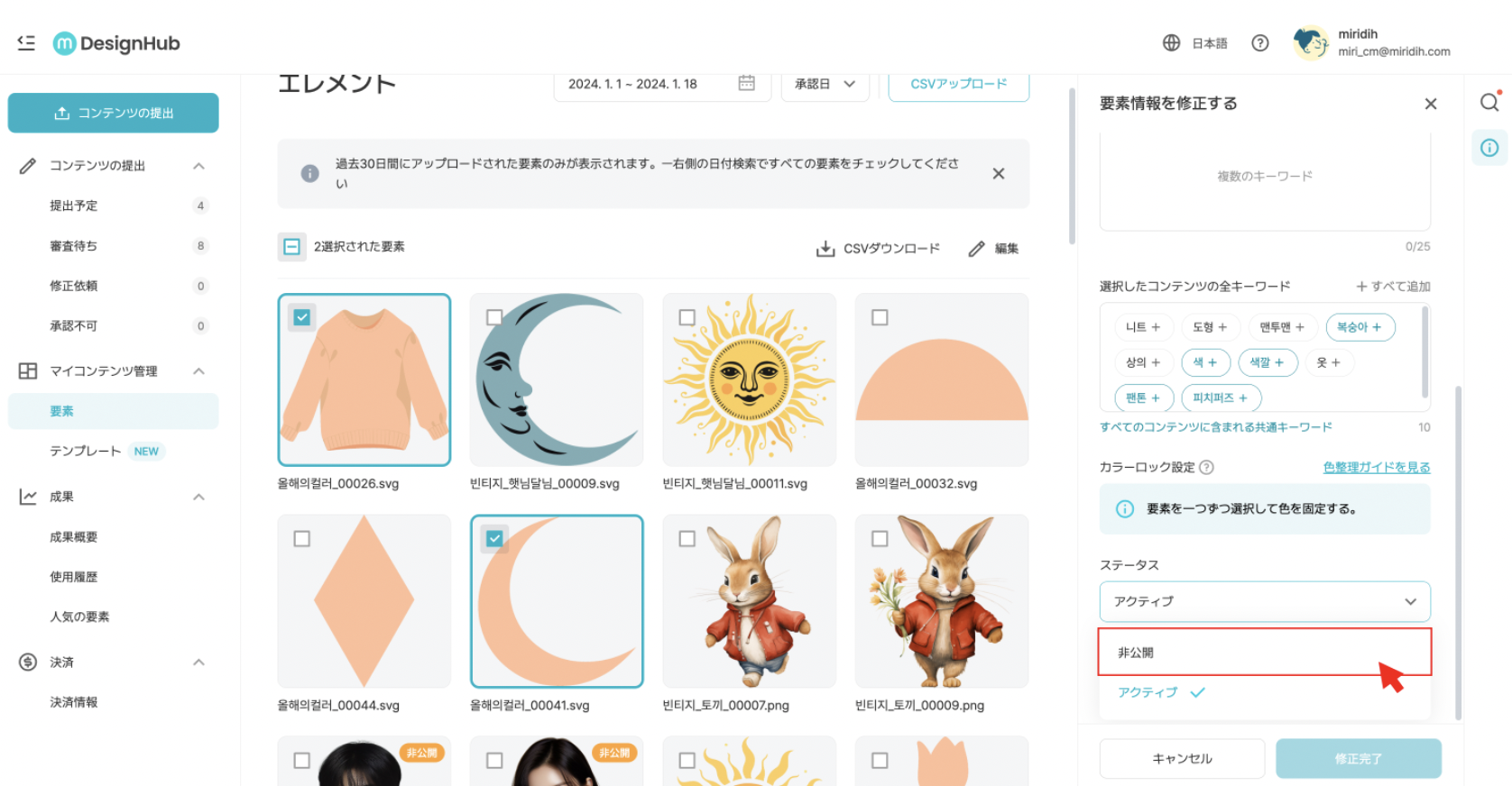 - 非公開の素材は、MiriCanvasで非表示となります。 ただし、テンプレートやユーザーのデザインに使用された場合、その素材は維持されます。