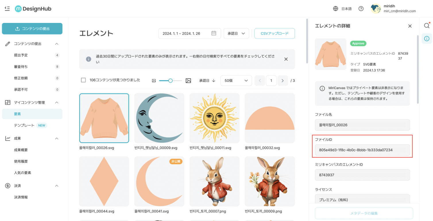 承認済みのコンテンツのファイルIDは、デザインハブ右側のⓘアイコンをクリック>素材の詳細からご確認いただけます。
