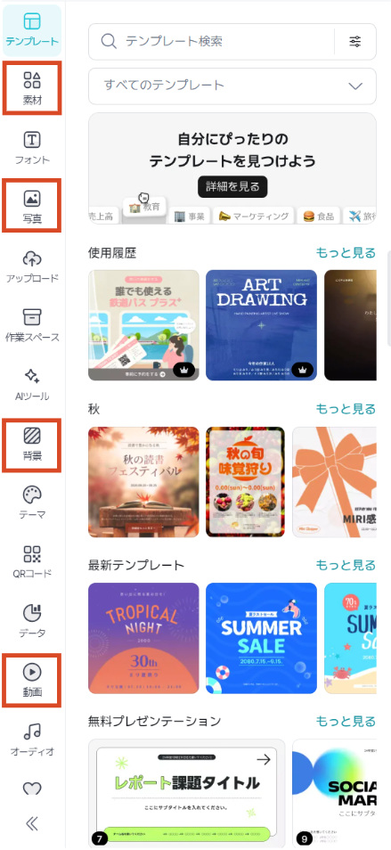 1) MiriCanvasにアクセスした後、確認したいコンテンツタイプ(素材、写真、背景、動画など)を選んで下さい。