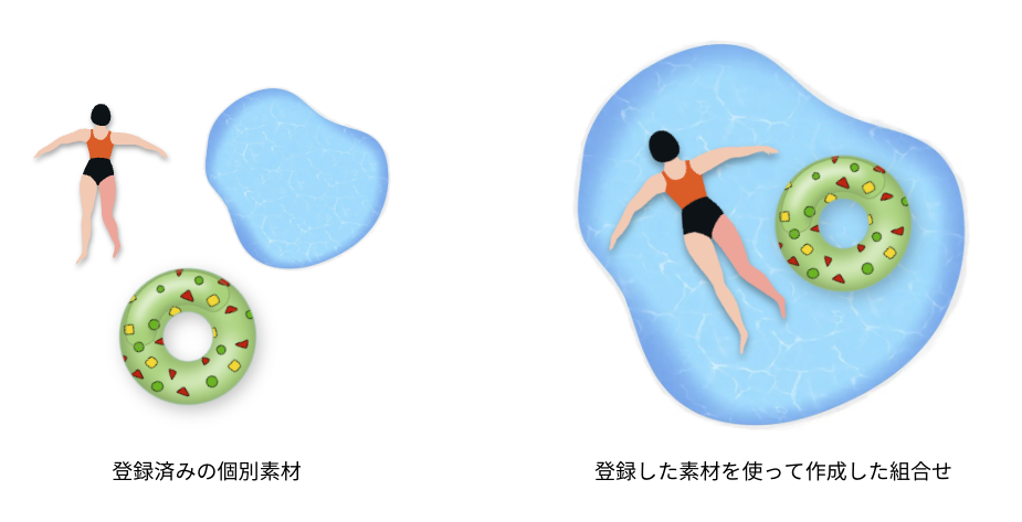 登録されている様々な素材を他のコンテンツと組み合わせて、一つの素材として登録することができます。