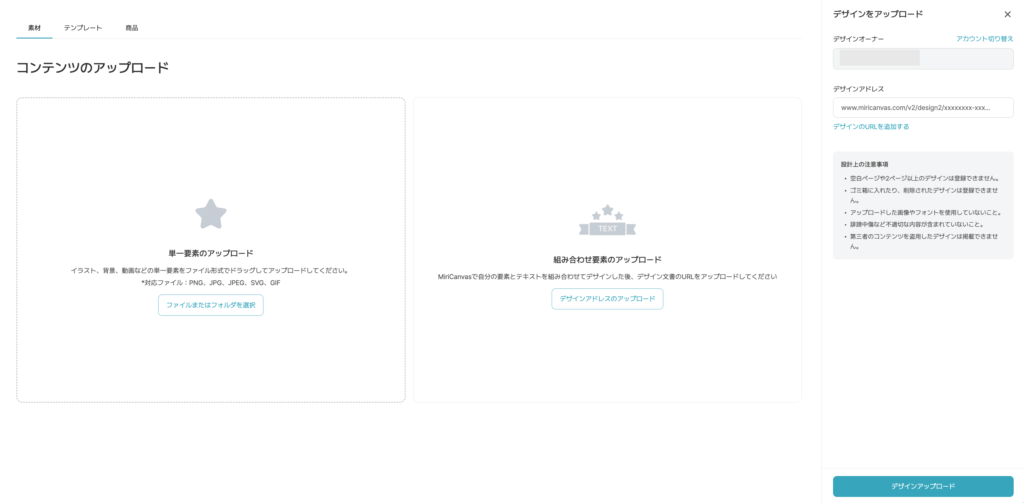デザインアドレスに、連携されたMiricanvasのIDで作成したデザイン文書のURLを入力してください。