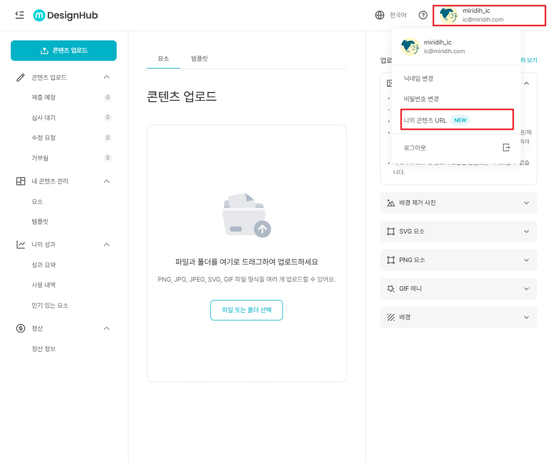 1. 디자인허브 우측 상단의 프로필 이미지를 클릭하여 나타나는 메뉴에서 나의 콘텐츠 URL을 클릭해주세요.