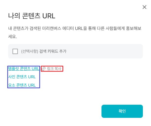 나의 등록된 콘텐츠 중 그 키워드로 검색된 요소/사진/템플릿을 바로 사용할 수 있는 미리캔버스 접속 URL이 생성됩니다.