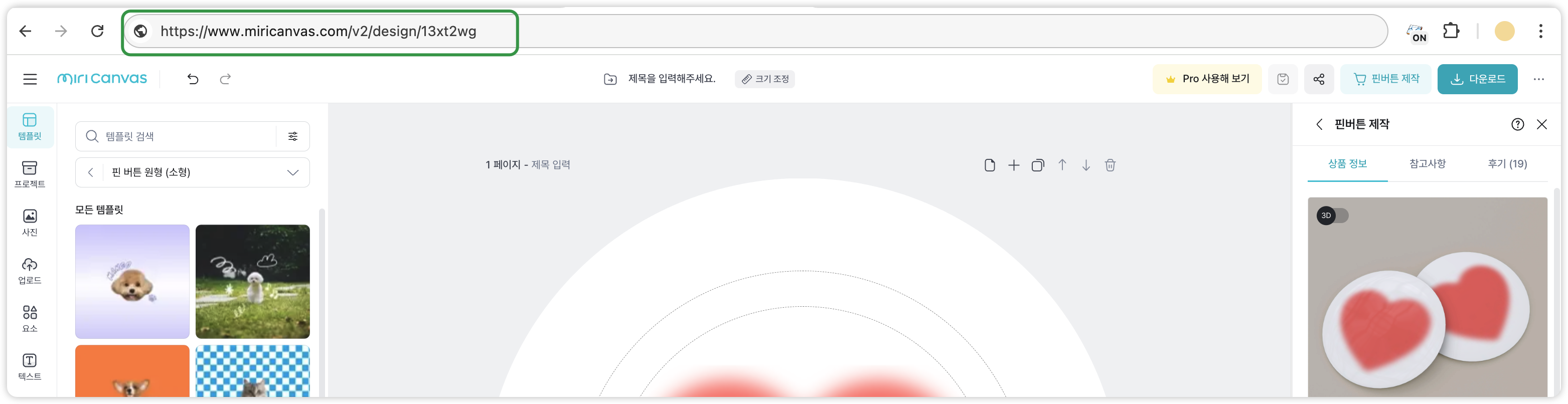 ② 디자인허브 내 우측 패널에서 '디자인 주소' 입력란에 주소 붙여넣기