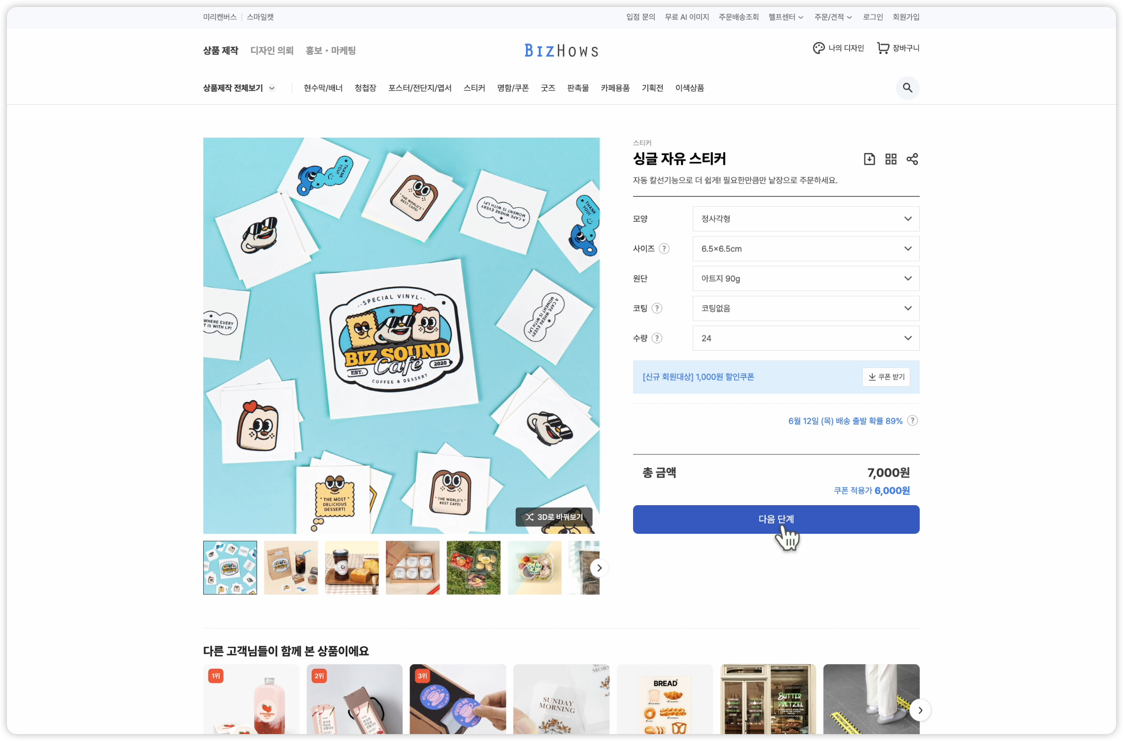 - ⑦ 현재 디자인으로 제작하러 가기 를 누르는 경우, 비즈하우스 상품 페이지 > 다음 단계 를 눌러주세요.