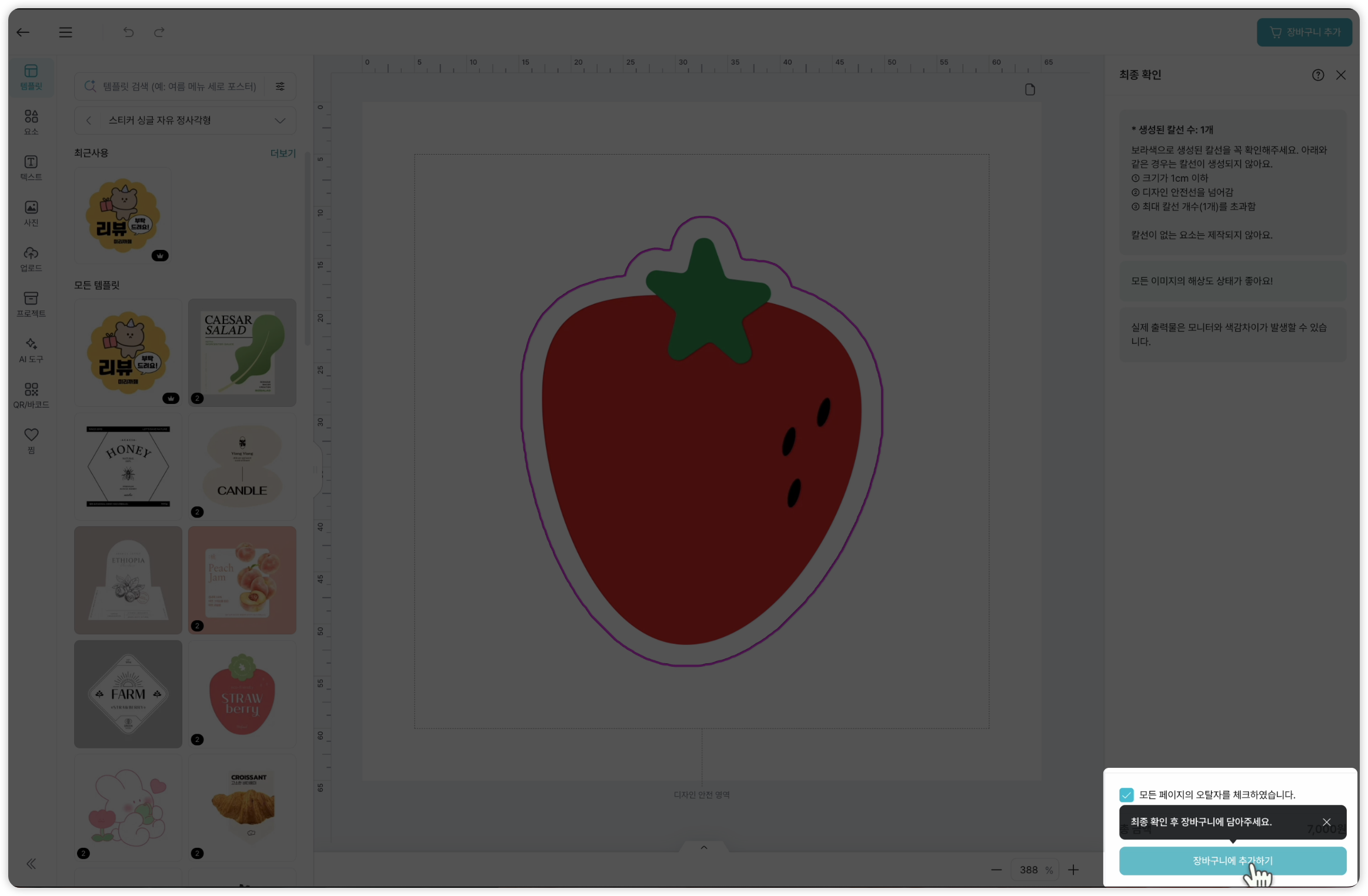 - ⑨ 상품 옵션에 맞춰 디자인을 완료 한 다음, 장바구니에 추가하기 버튼을 눌러주세요.