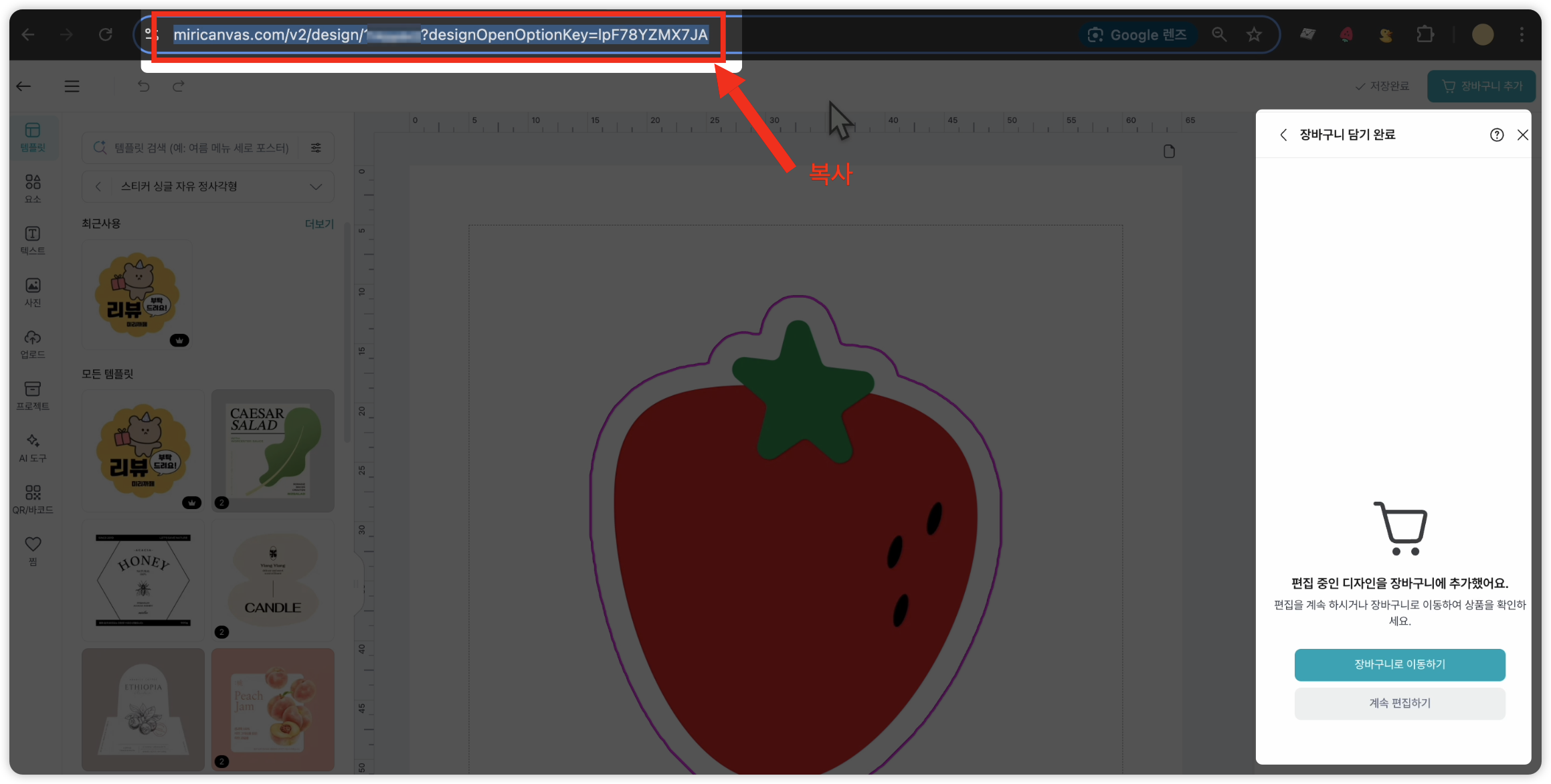 - ⑩ 저장된 디자인 링크를 복사해 디자인허브 디자인 주소 입력에 활용해주세요.